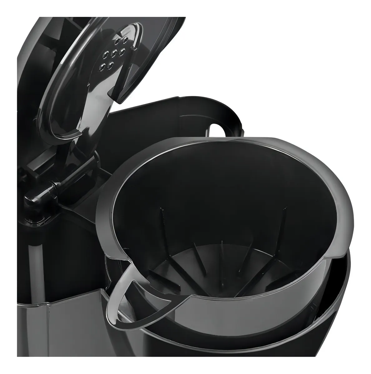 Cuenta con función antigoteo, que permite servir café antes de que termine el ciclo, placa calefactora para mantenerlo caliente y jarra de vidrio resistente con asa ergonómica. Además, su filtro permanente y removible facilita la limpieza y reduce el uso de filtros desechables.