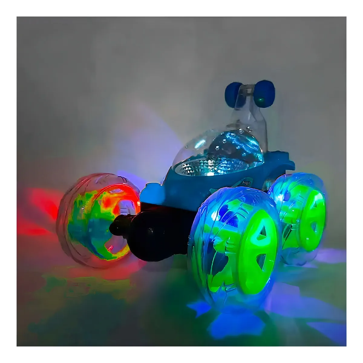 Carro acrobático a control remoto 360°, con luces LED, giros extremos y ruedas todo terreno. Ideal para niños, resistente y divertido para jugar en interiores o exteriores.